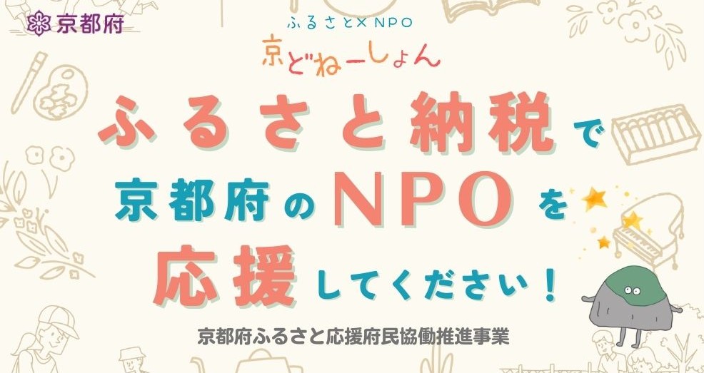「よりよい明日をつくりたい!」「地域のための活動を応援したい!」そんなときは「京どねーしょん」。あなたの想いを地域に届け、使われ方をしっかりと見守ることのできる「新しい寄附のカタチ」が今、広がっています。京どねーしょんには、物品による返礼はありません。その代わり、皆さまからの寄附は、地域をよりよくするための NPO の活動に活かされます。地域や未来の豊かさこそが、京どねーしょんからの”返礼”です。京どねーしょんに「寄附対象団体」として登録されている京都府の認定 NPO 法人等の中から、あなたが応援したい団体を選んで寄附することができます。また、特定の団体を指定せず、京都府が実施する地域活動への
