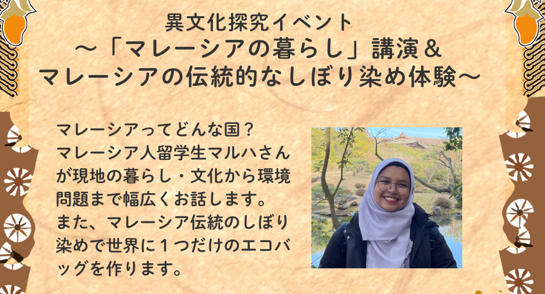 本イベントでは、マレーシア人留学生マルハさんが現地の暮らし・文化から環境問題まで幅広くお話します。また、マレーシア伝統のしぼり染めで、世界に一つだけのオリジナルエコバックを作ります。完成した作品はお持ち帰り頂けます!