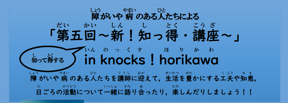 傷害や病のある人達を講師に迎えて、生活を豊かにする工夫や知恵、日ごろの活動について一緒に語り合ったり、楽しんだりしましょう。