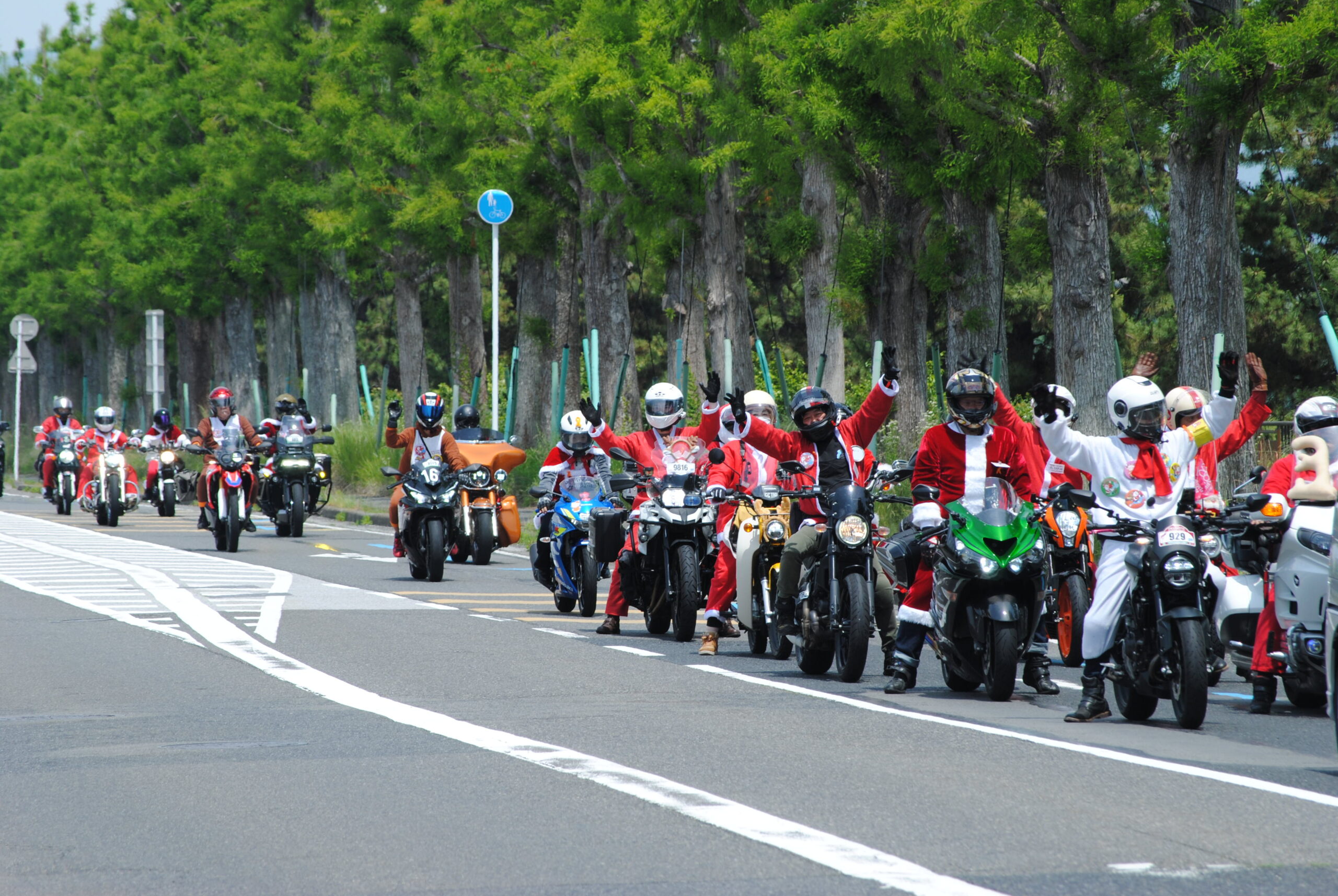 また、沿道でサンタライダーに声援を送って頂くとライダーもピースサインで答えてくれるので、是非見学にいらしてください。