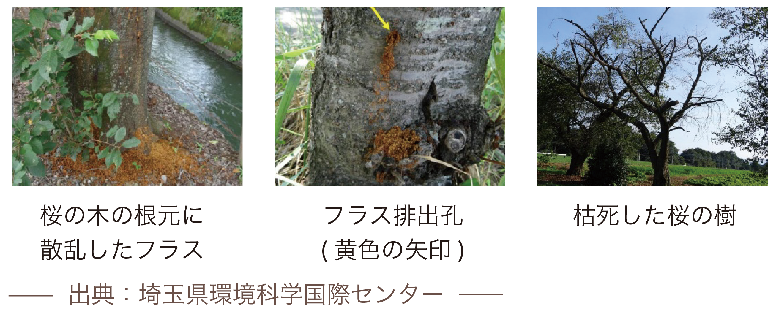 幼虫が樹木から排出するフラス(木くずと糞の混合物)の発見と通報