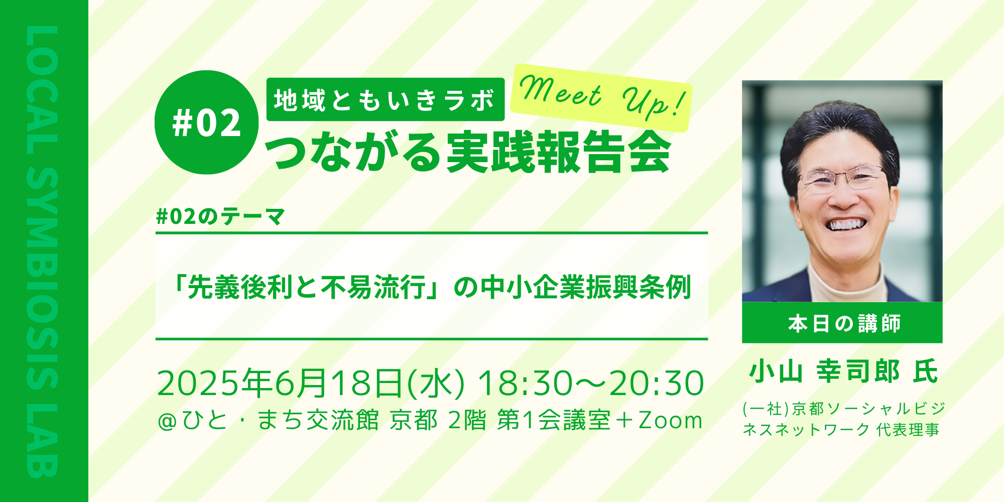 今回の#02では、この議論をさらに深掘りします。講師に(一社)京都ソーシャルビジネスネットワーク代表理事の小山幸司郎氏をお招きし、約40年にわたる元京都市職員としての経験を踏まえ、行政の視点からこの条例の意義と可能性について語っていただきます。