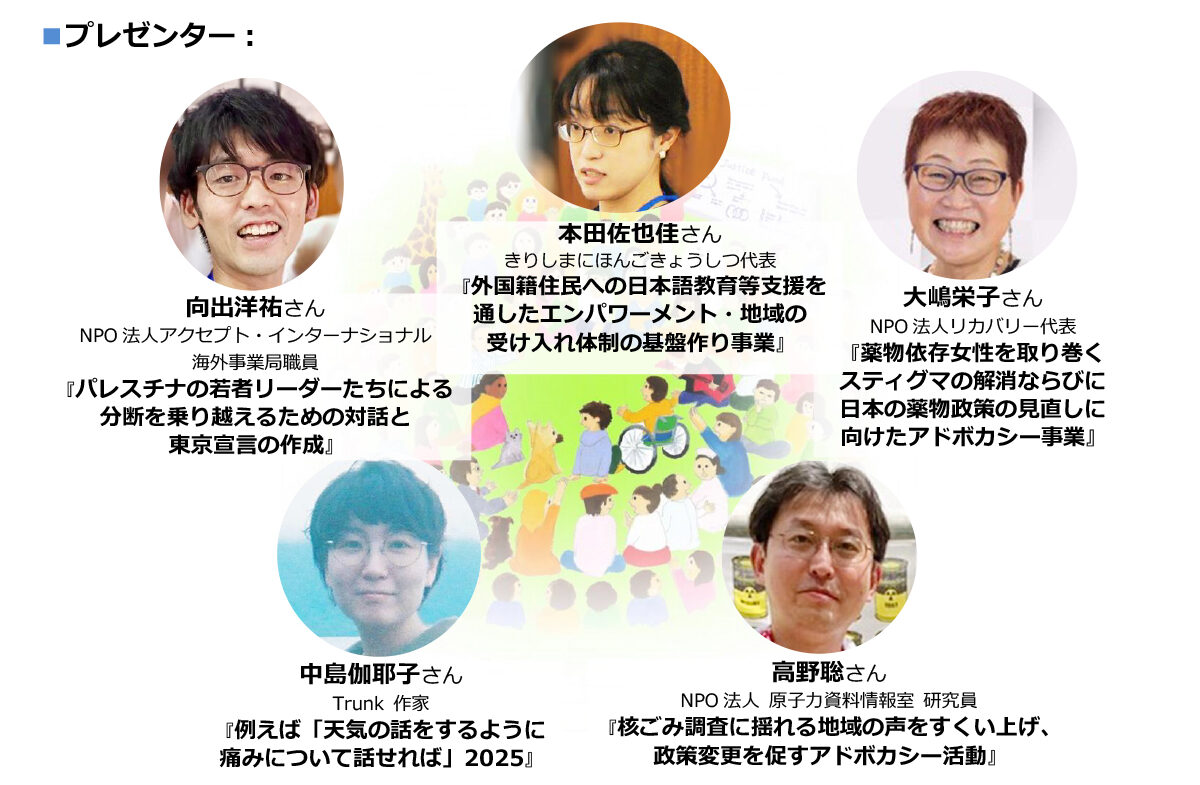 世界の一員である私たち一人ひとりも加担しているかもしれない“分断”を看過せず、平和と人権への思いを共有して乗り越えていく市民による取り組みが、草の根からグローバルまで続いています。本企画では、ソーシャル・ジャスティス基金の公募第 13 回による助成を受けたそういった市民のみなさんから、成果や効果、課題や展望を率直に発表いただきます。試行錯誤からの学びや、困難な中でも楽しさを感じられたエピソード等もみなさんと共有したいと思います。さらにパネル対話では、「共生とは何か」、「自分の中にある“偏見”に目を向ける」、「対立を乗り越えるために第三者が関わる意義」等のテーマで悩みを語り合います。公正な社会、ソーシャル・ジャスティスとは何かを見つめながら、課題解決に向けて市民が連携して声を上げられる新たな一歩になれば幸いです。