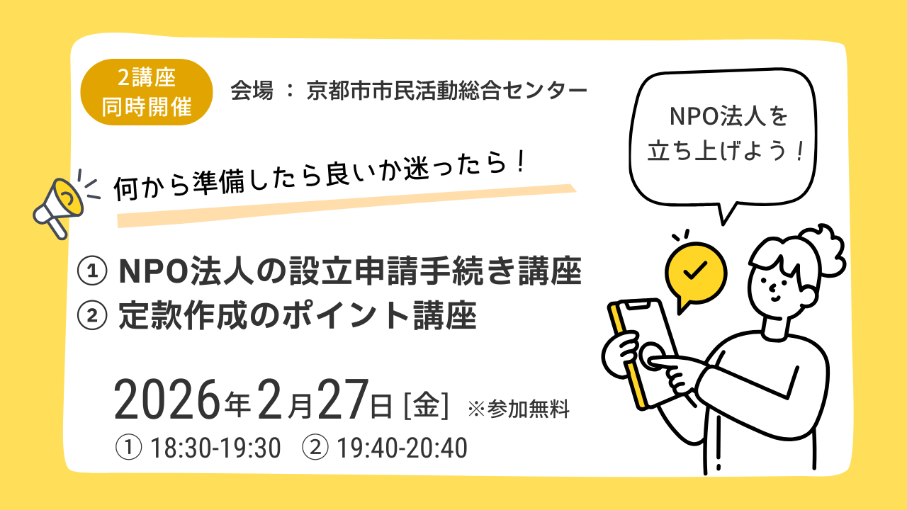 京都市市民活動総合センター (設立申請) 2026 年 2 月 27 日 (金) 京都市市民活動総合センター (定款作成) 2026 年 2 月 27 日 (金) |
