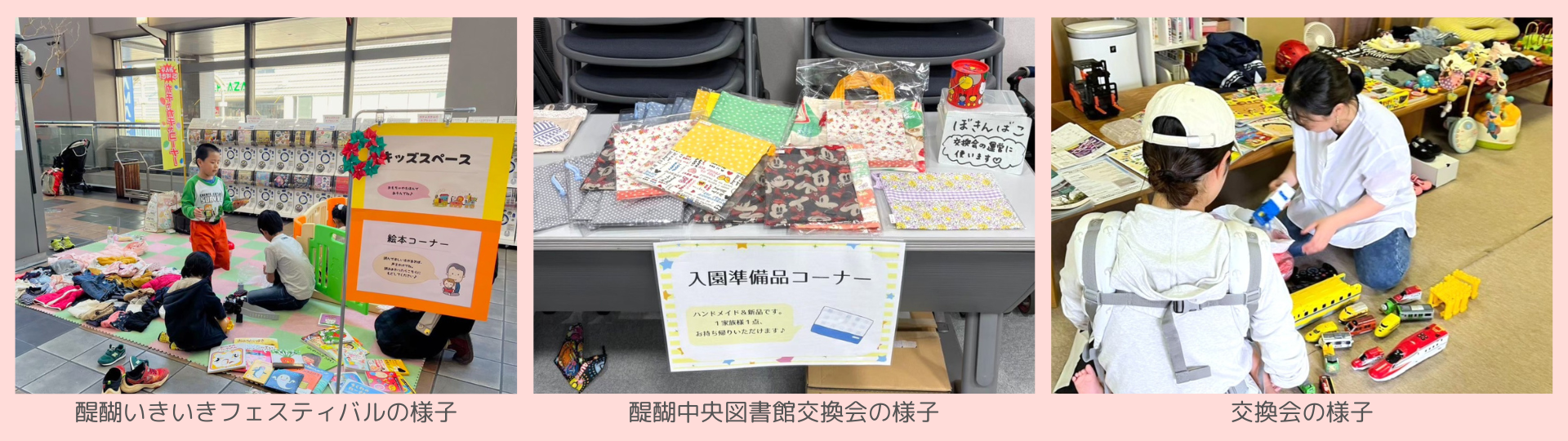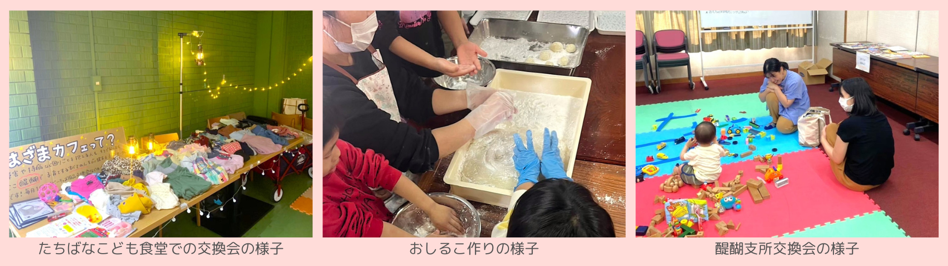 交換会は、乳幼児健診に合わせて伏見区の醍醐支所の会議室で開催することもあり、健診に来た母親が気軽に立ち寄れる機会を提供しています。また、おしるこ作りなどの料理体験や工作イベントも開催し、参加者が子どもとゆっくりと過ごせる場も提供しています。