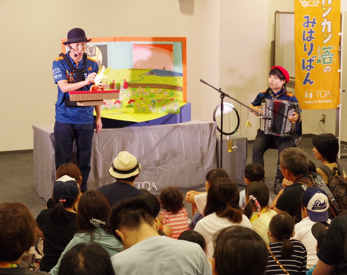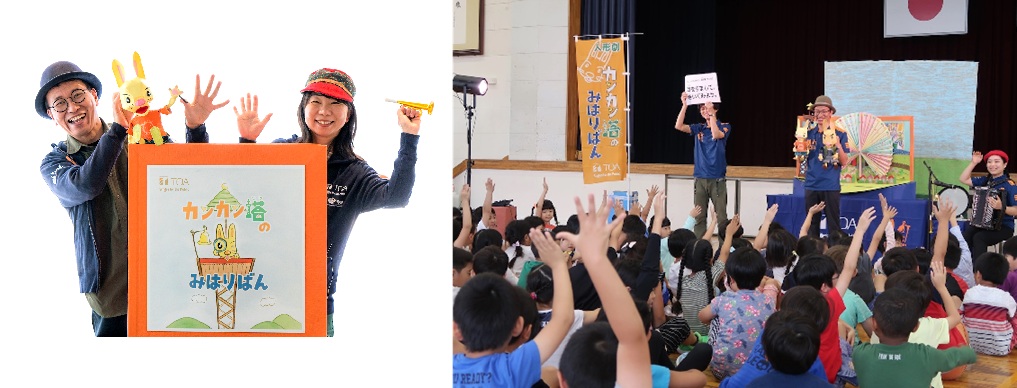 「カンカン塔のみはりばん」は、神戸の音響機器メーカーTOA株式会社による音の防災・減災の人形劇です。たくたく堂という人形劇団とアコーディオン奏者によるチームで、災害を知らせる音の意味や重要性に気づいてもらうための取り組みとして行っています。
